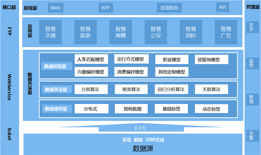 基于电信运营商的移动位置数据分析挖掘用户行为轨迹,实现区域人群数量的实时监控;同时基于用户基本信息和行为数据,分析人群位置分布、驻留时间、性别年龄、常驻人口、流动人口等属性,辅助各类行业客户进行科学决策,如智能交通、智慧旅游、智慧商圈、智慧公安、智慧消防和智慧广告。