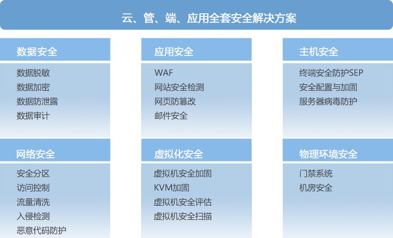 · 安全服务:安全检测服务、安全加固服务、安全审计服务、安全评估服务、流量清洗服务、访问控制服务、数据脱敏加密服务……