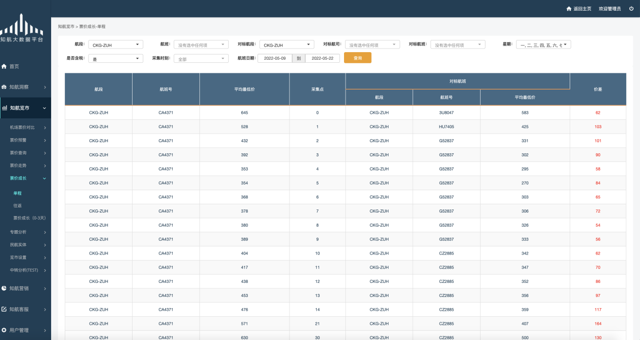 航线未来票价走势数据,监控票价走势,及时响应预售票价变化;订制航线票价、区域票价、 机场整体票价数据实时查询。