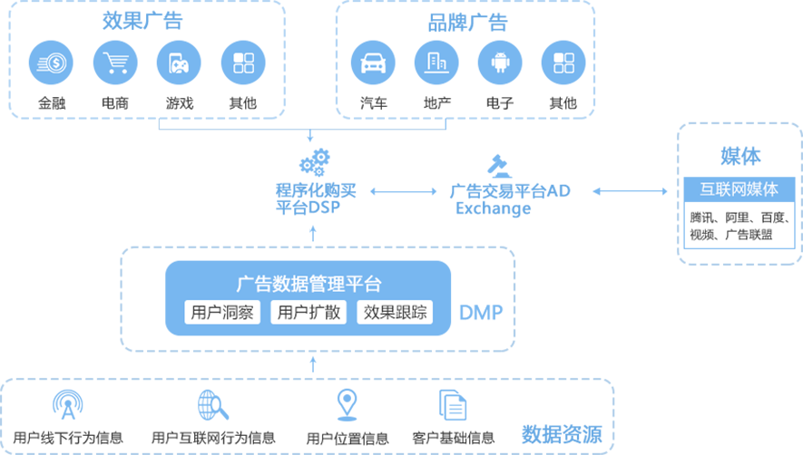 实现方式:基于电信运营商数据,在电信运营商机房内部署精准营销平台(DMP)实现客户分群,在公网环境中部署广告投放平台(DSP)实现广告投放。通过物理隔离及脱敏加密传输保证用户数据安全。