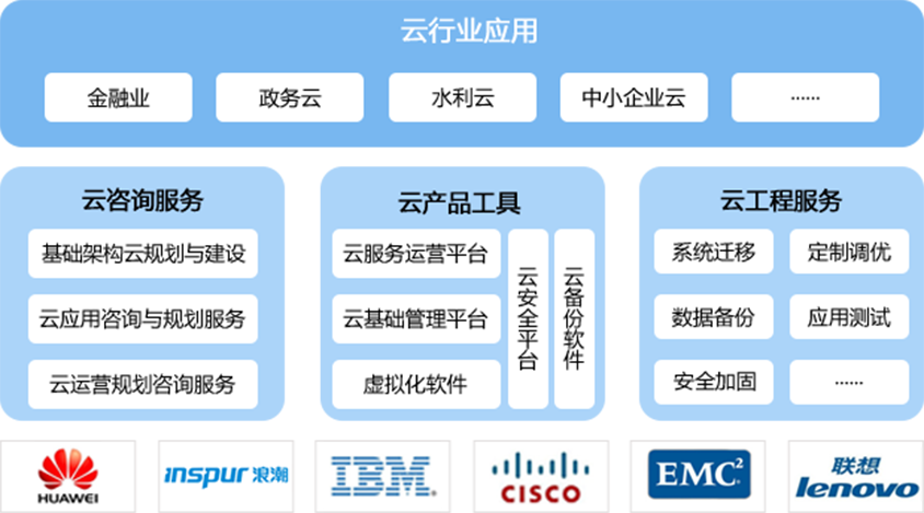 · 云产品工具:云服务运营平台、云基础管理平台、虚拟化软件、云安全平台、云备份软件。
